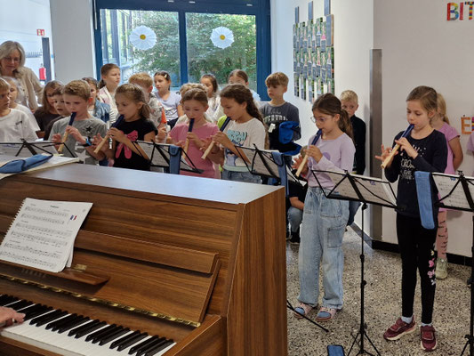 In Kooperation mit der Blasmusikkapelle Siebenbürgen aus Setterich war es auch in diesem Schuljahr möglich verschiedene Flötengruppe sowohl in Loverich als auch in Setterich anzubieten. Kurz vor den Ferien präsentierten die Kinder stolz, was sie in diesem Schuljahr geübt hatten.